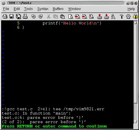 When coding in C one often has a edit-compile-edit cycle. Typically you would edit C file using some the things I've mentioned earlier, save the file, compile the code and go to the error(s) and start editing again. VIM helps save the cycle time slightly using a mode called quickfix. Basically, one has to save the compiler errors in a file and open the file with VIM using the command