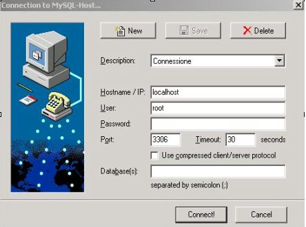Connection (Figure 11-3): Clicking on File->Connection, we will get an interface in which we are asked to enter the host, user and password. If we have to use MySQLFront locally, we will leave the localhost entry untouched.