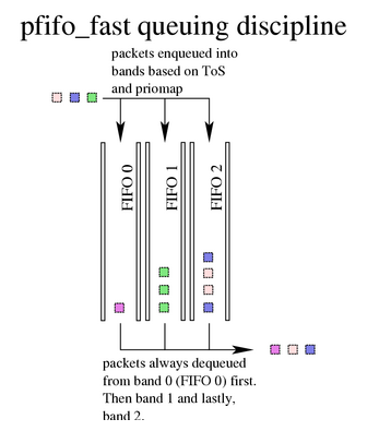 The pfifo_fast qdisc is the default qdisc for all interfaces under Linux. Based on a conventional FIFO qdisc, this qdisc also provides some prioritization. It provides three different bands (individual FIFOs) for separating traffic. The highest priority traffic (interactive flows) are placed into band 0 and are always serviced first. Similarly, band 1 is always emptied of pending packets before band 2 is dequeued.